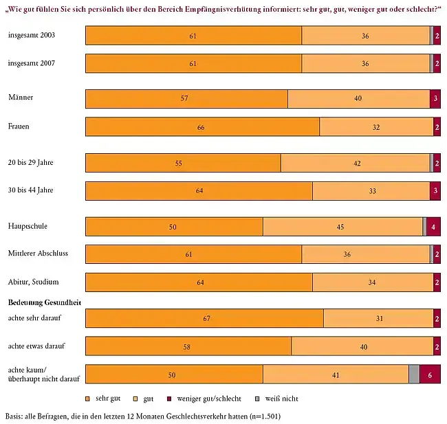 An erster Stelle wird hier die Ärztin bzw. der Arzt (69 %) genannt. 60 Prozent würden am liebsten über Aufklärungsbroschüren, 52 Prozent über Berichte in Illustrierten oder Zeitungen und 51 Prozent über Gespräche mit ihrem Partner bzw. ihrer Partnerin weitergehend informiert werden. An fünfter Stelle folgt bereits das Internet, das 50 Prozent als Informationsquelle zum Thema Verhütung präferieren. Damit hat dieses Medium, das 2003 noch auf Platz 8 der präfierten Informationsquellen rangierte, auch hier deutlich an Gewicht gewonnen, während Aufklärungsbroschüren und Bücher (damals an erster bzw. vierter Stelle) diesbezüglich an Bedeutung verlorenhaben.