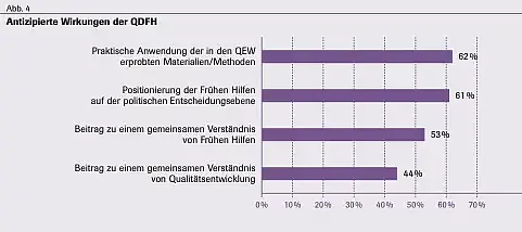 Die ersten Evaluationsergebnisse der QDFH beziehen sich auf einen Zeitpunkt im Projektverlauf, zu dem noch nicht alle geplanten Aktivitäten der QDFH umgesetzt waren. Sie konnten allein schon deshalb noch nicht ihre volle Wirksamkeit entfalten. Zudem war ihre Umsetzung nach Einschätzung der Teilnehmenden durch die COVID-19-Pandemie stark beeinträchtigt worden. Am gravierendsten wurde hierbei empfunden, dass keine Präsenzveranstaltungen der QDFH mehr möglich waren und dass der Transfer der Ergebnisse in die kommunalen Netzwerke erschwert war. Aber auch nach dem Ende der Projektlaufzeit im Juni 2021 ist es noch nicht realistisch, Wirkungen auf allen Ebenen der Wirkungstreppe zu erwarten. Etwa ab Stufe 5 der QDFH Wirkungstreppe – also der Umsetzung der ausgebauten QE-Kompetenzen in den Kommunen – ist es auch eine Frage der internen Abläufe in den kommunalen Netzwerken, wann mit der Umsetzung begonnen wird. Hiervon wiederum hängt unmittelbar ab, wann sich tatsächlich qualitative Weiterentwicklungen im Angebotsspektrum der Frühen Hilfen nachweisen lassen.