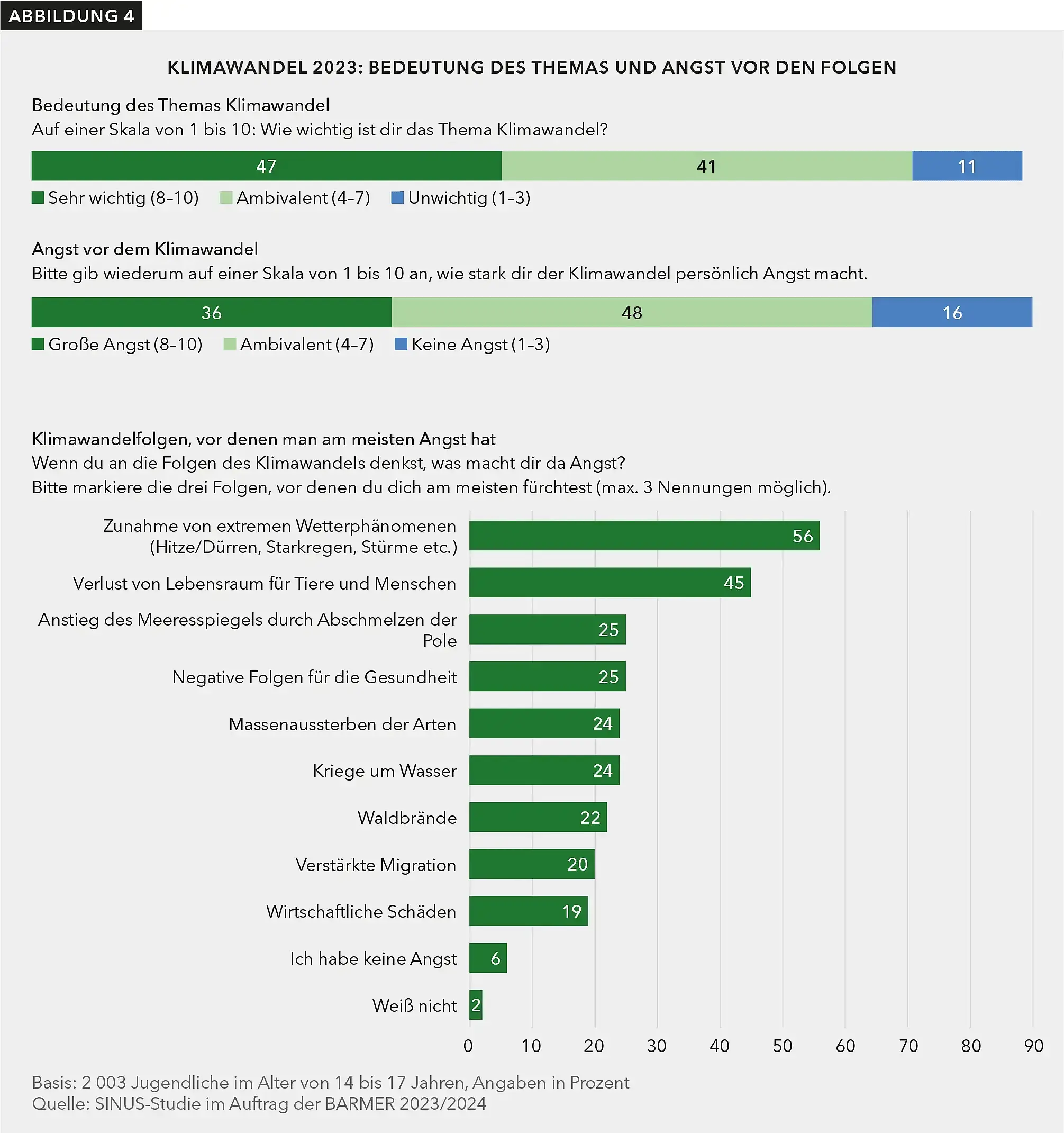 Klimawandel als Thema hat insgesamt seit 2021 etwas an Wichtigkeit eingebüßt. Dennoch ist er für fast die Hälfte der Jugendlichen weiterhin sehr wichtig (Werte 8–10 auf einer 10er-Skala), und er macht nahezu unverändert vielen Jugendlichen große Angst.