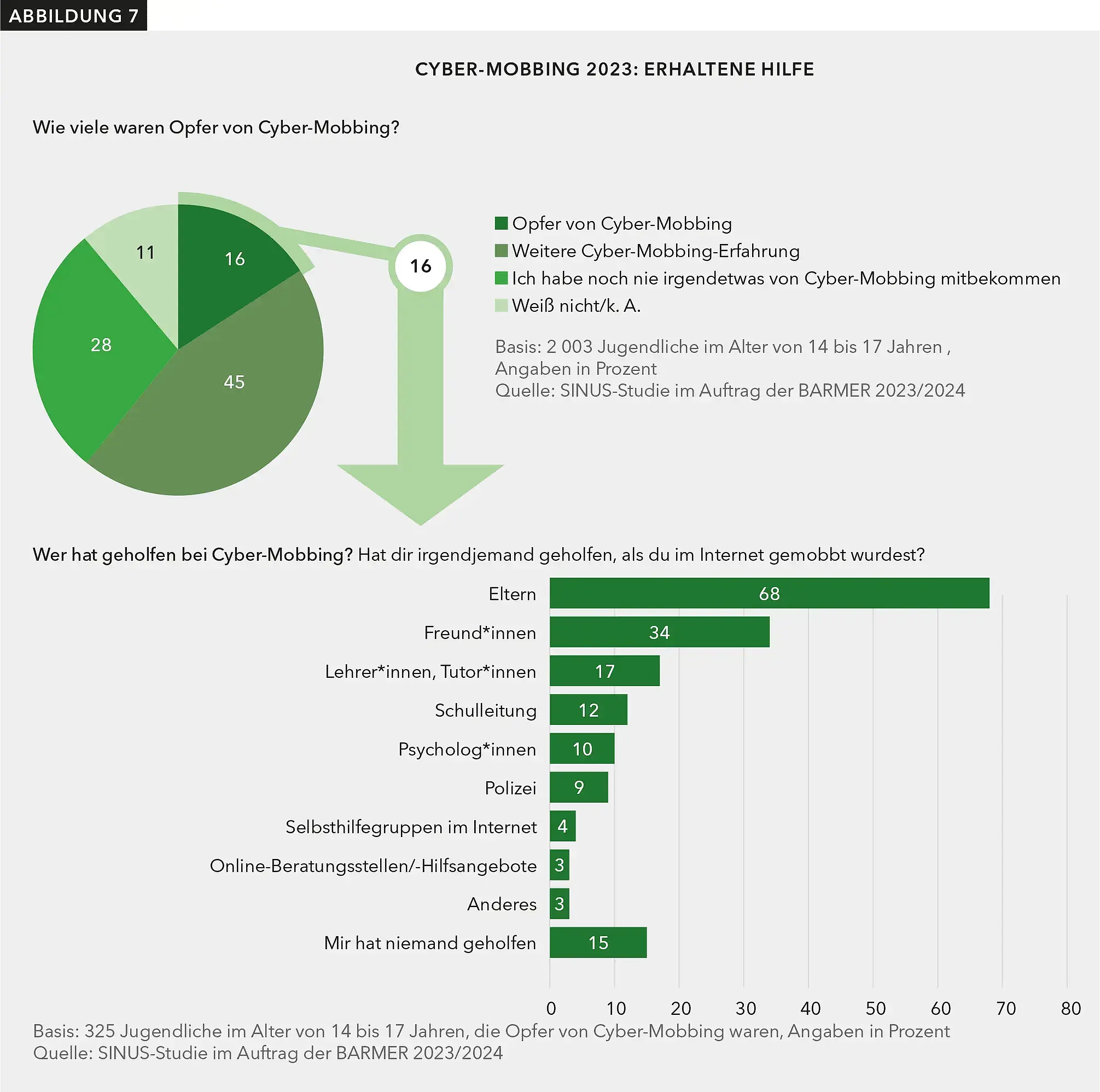 Wenn gefragt, an wen man sich im Fall von Cyber- Mobbing wendet oder wenden würde, bleibt das Nahumfeld nach wie vor die bevorzugte Anlaufstelle: Drei Viertel der Jugendlichen nennen hier ihre Eltern. Aber auch bei Freund*innen (46 %) sowie bei Lehrkräften und Tutor*innen (24 %) würde man Unterstützung suchen. Andere Fachkräfte und/ oder Institutionen/Stellen haben wenig(er) Jugendliche auf dem Schirm. Die Anzahl derer, die sich an niemanden wenden (würden) bzw. Cyber-Mobbing ignorieren oder es selbst lösen möchten, nimmt gegenüber 2022 zwar wieder deutlich ab, ist aber weiterhin ungut hoch (24 %) (ohne Abbildung). Im Ernstfall haben die Eltern von tatsächlich betroffenen Jugendlichen auch als Einzige mehrheitlich Hilfe geleistet. Bei den 15 %, denen laut Eigenaussage niemand geholfen hat, muss offenbleiben, ob Hilfe nicht gewollt war, nicht gewährt wurde oder die betroffenen Jugendlichen sich niemanden als Hilfe vorstellen konnten und deshalb auch nicht gefragt haben. Psychisch belastend bleibt es allemal (siehe Abbildung 7).