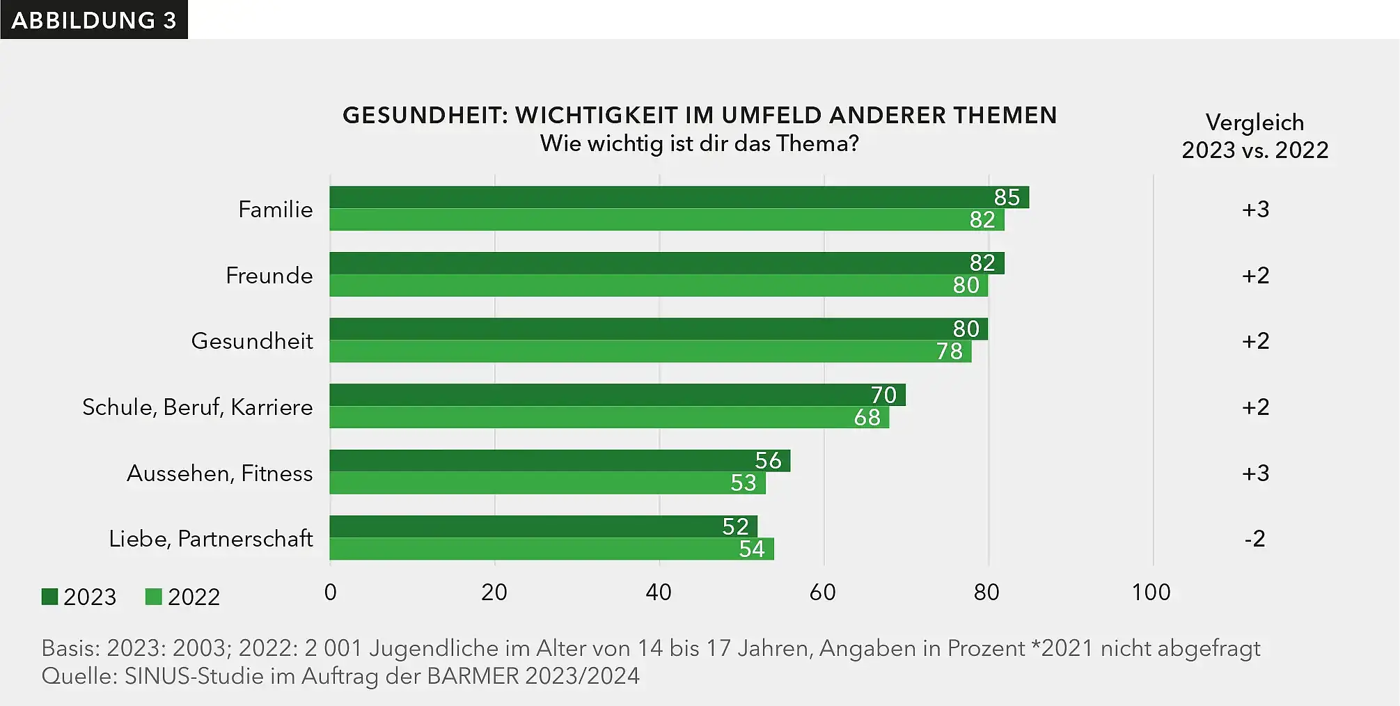 Soziale Eingebundenheit hat auch 2023 für die Jugendlichen einen äußerst hohen Stellenwert. So kommt Familie und Freund*innen2 unter Alltagsthemen weiterhin die größte Bedeutung zu. Aber selbst für die altersgemäß gesundheitlich meist noch von Einschränkungen verschonten Jugendlichen rangiert Gesundheit direkt im Anschluss (und für die Zukunft erwarten mehr als die Hälfte einen weiteren Bedeutungszuwachs dieses Themas). Schule, Beruf und Karriere, aber auch Aussehen, Fitness sowie Liebe und Partnerschaft sind dem nachgeordnet, bleiben aber wichtige Themen (siehe Abbildung 3).