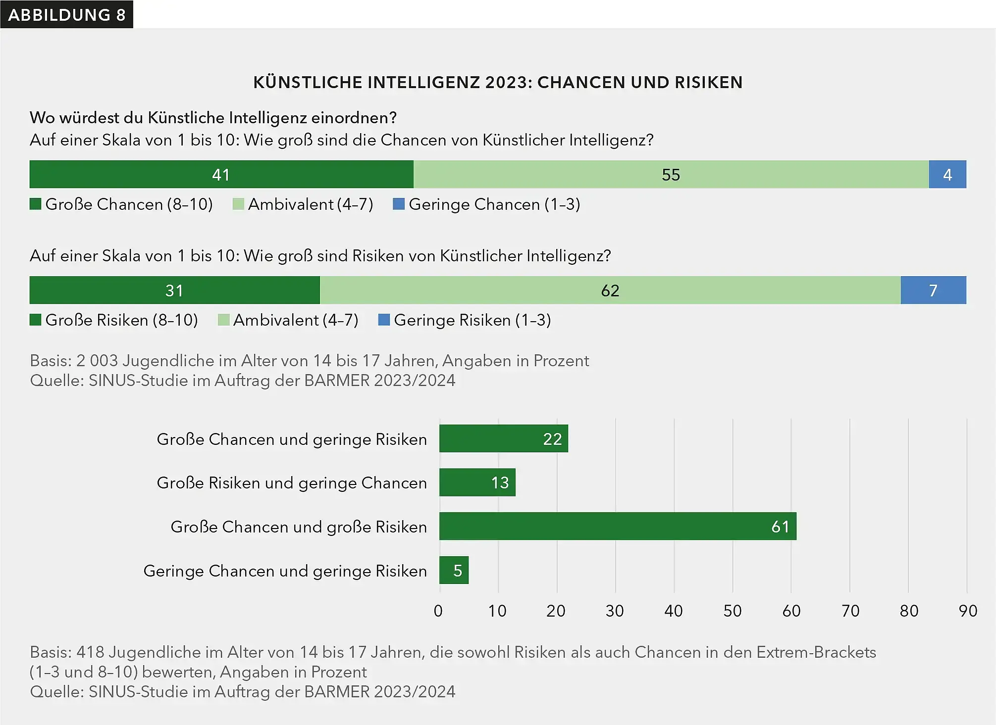 Insgesamt verbinden mehr Jugendliche mit KI große Chancen als große Risiken, was aber nicht bedeutet, dass das Risikopotenzial kleingeredet wird. Es herrscht eher eine ausgesprochene »Sowohl als auch«-Attitüde vor: Kreuzt man die Antworten zu Chancen und Risiken, dann geht eine Mehrheit der Jugendlichen von einem Gleichgewicht von Chancen und Risiken aus. In anderen Worten: Die Jugendlichen haben keine Angst vor KI, da sie viele Chancen bietet, sehen aber gleichzeitig die Notwendigkeit eines (reflektierten) Umgangs mit den zweifelsfrei vorhandenen Risiken (siehe Abbildung 8).