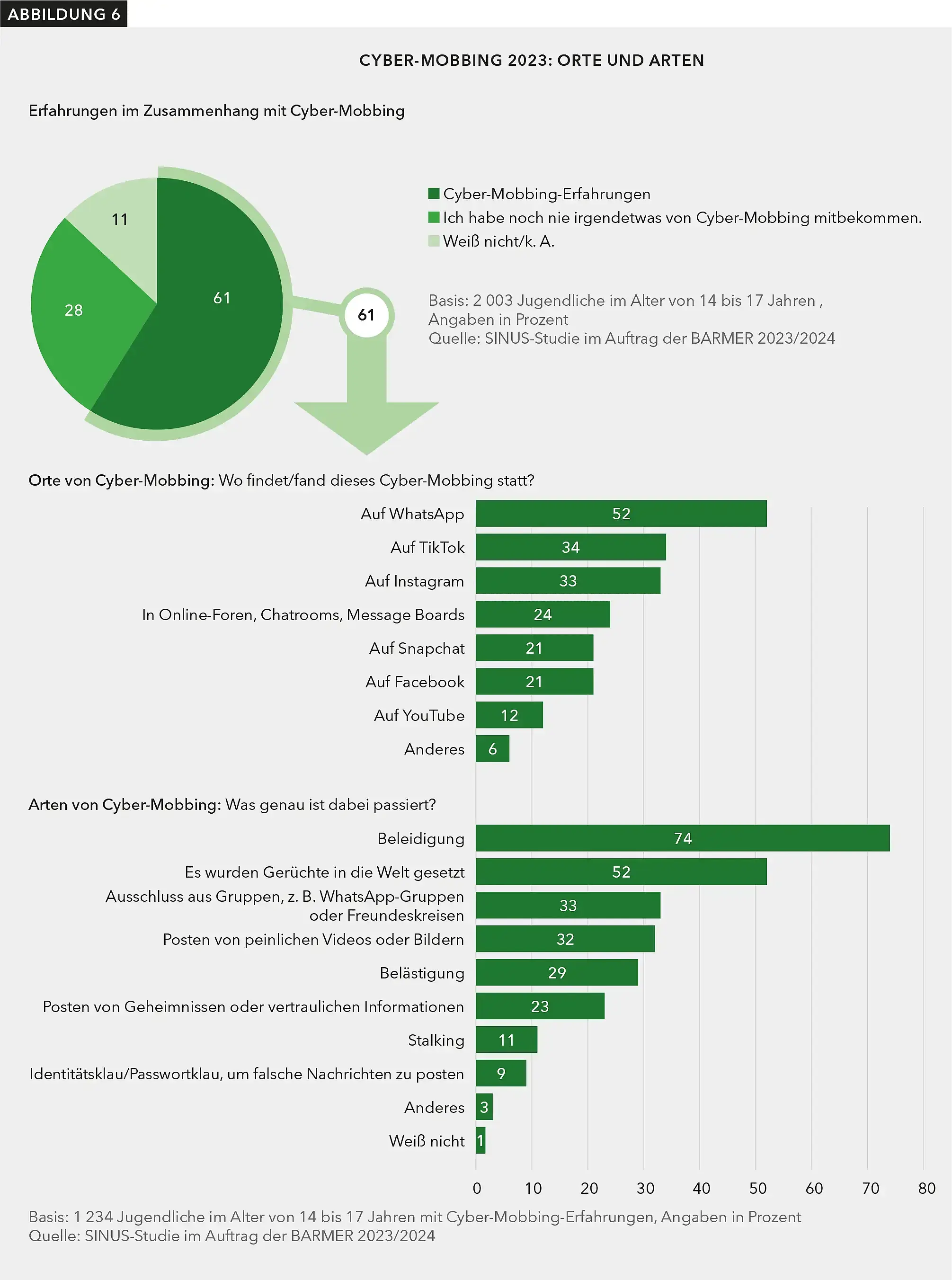 Ein Leben ohne Handy und Social Media, ohne digitales Eingebundensein, ist für Jugendliche kaum vorstellbar (und auch nicht erstrebenswert), aber es geht damit auch eine besorgniserregende kontinuierliche Zunahme der Erfahrungen mit Cyber-Mobbing einher (von 51 % im Jahr 2021 auf 61 % 2023). Gleichzeitig nimmt die Anzahl der Jugendlichen ab, die Erfahrungen mit Cyber-Mobbing nicht angeben können (oder wollen). Dies könnte weniger Scham, einem höheren Problembewusstsein und/oder einem besseren Einordnen-Können geschuldet sein, was Cyber-Mobbing ist und wo es beginnt. Noch nie etwas von Cyber-Mobbing mitbekommen zu haben bekunden nur 28 % der Jugendlichen.