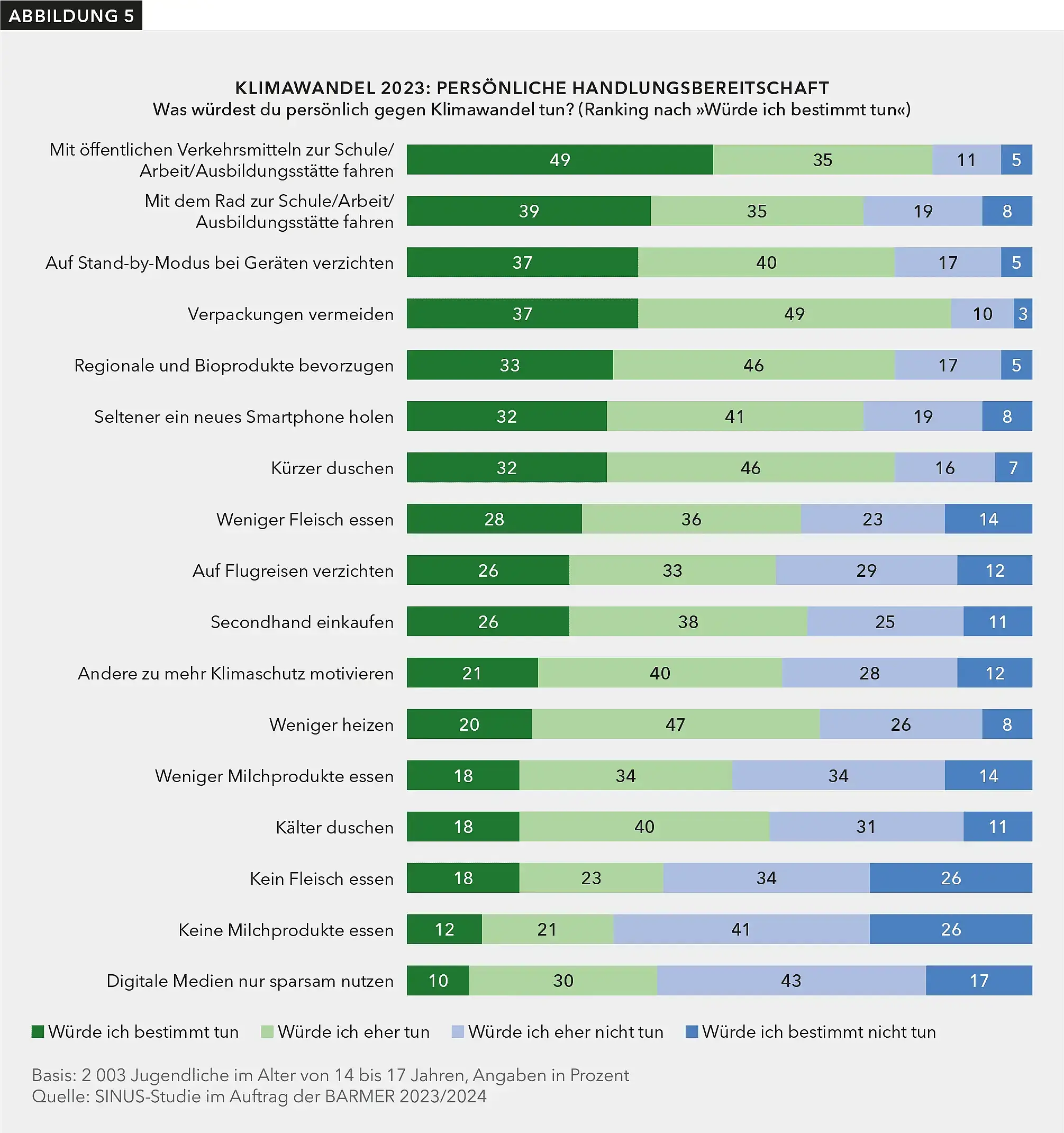 Entgegen häufig geäußerten Zweifeln in der Gesellschaft ist die persönliche Handlungsbereitschaft unter Jugendlichen weiterhin stark ausgeprägt. Besonders bei Mobilitätsaspekten und Verpackungsfragen sind die Bereitschaft und der Konsens hoch. Auch zu Einschränkungen beim Duschen, Heizen, bei Flugreisen oder Einkaufswünschen wäre eine Mehrheit bereit. Bei digitaler Mediennutzung sowie dem Ernährungsverhalten (Verzehr von Fleisch, Konsum von Milchprodukten) ist radikaler Verzicht allerdings nach wie vor (trotz steigender Bereitschaft) nicht mehrheitsfähig (siehe Abbildung 5).