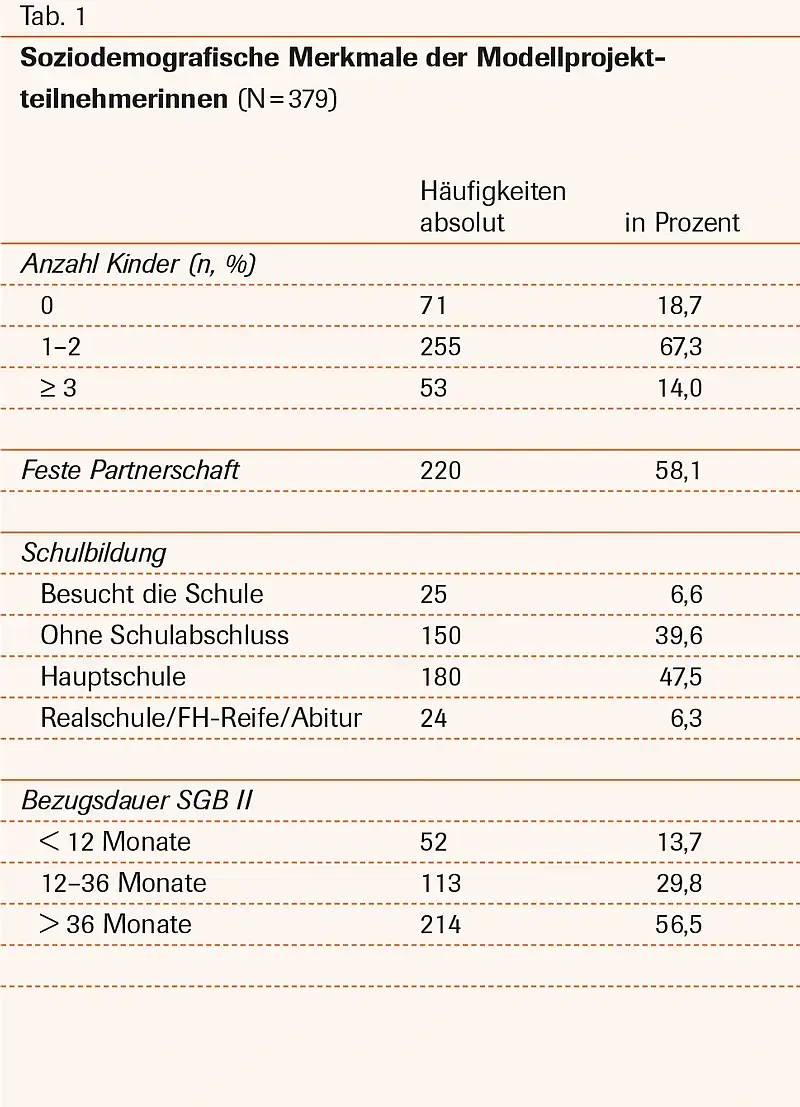 Insgesamt wurde das Angebot im Modellprojektzeitraum von 379 Frauen mit einem Durchschnittsalter von 27 Jahren genutzt. Weitere soziodemografische Merkmale sind in Tabelle 1 dargestellt. Im aktuellen Bezugszeitraum STL und bis zur Inanspruchnahme der kfV hatte ein Anteil von 13,2 Prozent der Frauen (n =50) ausschließlich »situative« Verhütungsmethoden angewandt (z.B. Kondom, Diaphragma, Portiokappe, Koitus interruptus), weitere 5,1 Prozent hatten nicht verhütet. Im Rahmen des Modellprojekts hatten sich 116 Frauen für eine andere als die bislang genutzte Verhütungsmethode entschieden. Von diesen legten zum Zeitpunkt der Eingangsbefragung 38 (32,5 %) die Verordnung für die Pille, 62 (53 %) die Verordnung für die Hormonspirale, 15 (12,8 %) die Verordnung für die Kupferspirale und 2 (1,7 %) die Verordnung für den hormonellen Verhütungsring vor.