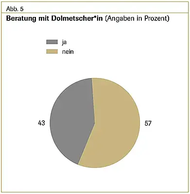 Fachlich gute Beratungen sind, vor allem bei psychosozialen Schwierigkeiten oder im Schwangerschaftskonflikt, oft nur mit Dolmetschen möglich. Fast die Hälfte (ca. 43 %) aller Beratungen, bei Gruppenangeboten sogar 66,5 Prozent , wurden 2017 mit Dolmetscher*innen durchgeführt. Zu beachten ist dabei, dass einige Berater*innen im Projekt selbst auf Englisch, Französisch oder Arabisch beraten können (s. Abb. 5).