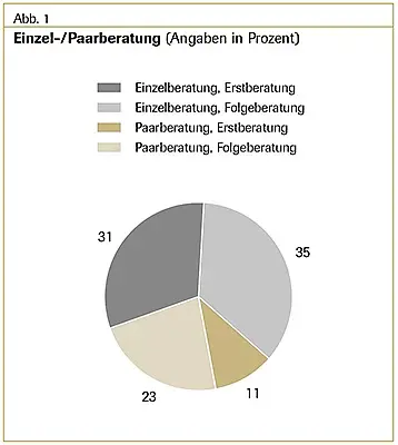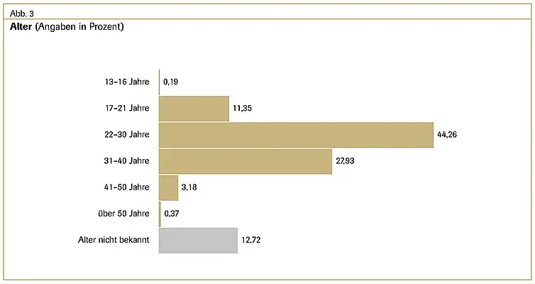 Die drei größten Gruppen beratener (schwangerer) Frauen (und ggf. ihrer Partner) bilden 17- bis 21-Jährige mit etwa 11 Prozent, 22- bis 30-Jährige mit ca. 44 Prozent, und 31- bis 40-Jährige mit fast 28 Prozent (s. Abb. 3).