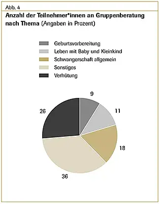Die Beratungsanlässe sind vielfältig, die Beratungen zeitaufwendig, weil die Klient*innen durch das Setting der Beratungstriade (s.o.) in ihrer Muttersprache Fragen und Unsicherheiten z. B. nach Untersuchungen zur Pränataldiagnostik klären können. Konflikte in der Paarbeziehung, Gewalt in der Ehe bzw. Partnerschaft, Genitalverstümmelung, Traumata und sexuelle Gewalt waren Inhalt von 19,3 Prozent der Beratungen. In 16,5 Prozent der Beratungen ging es um finanzielle und sachliche Unterstützung, u. a. um Stiftungsmittel für die Erstausstattung, aber auch um Verhütung/Familienplanung.