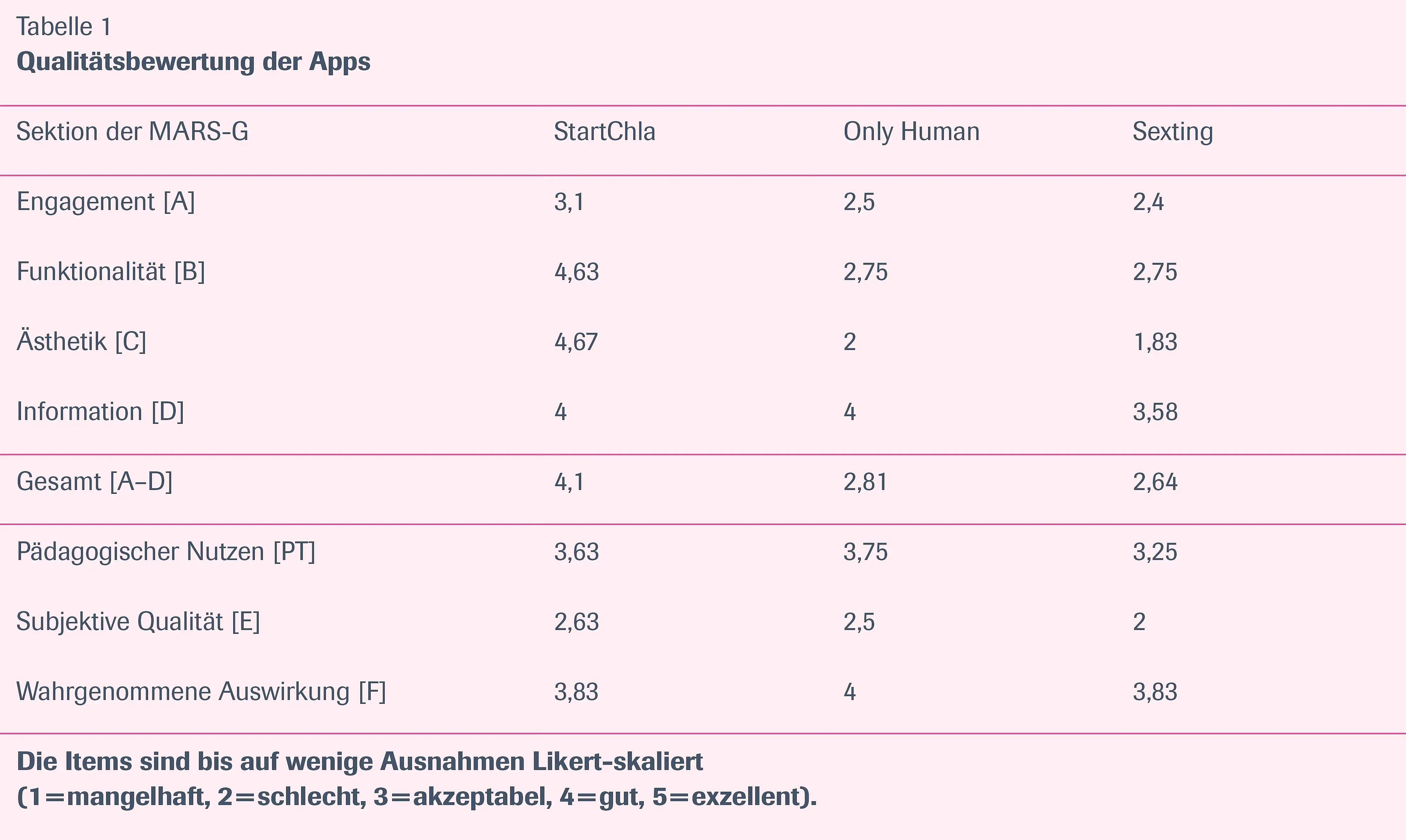 In Bezug auf Informationen und Unterstützungspotenzial, Risiken, Nebenwirkungen und schädliche Effekte sowie wahrgenommene Auswirkungen erzielten alle drei vorgestellten Apps akzeptable bis gute Werte. Die App StartChla schnitt auf der Subdimension subjektive Qualität etwas schlechter ab. Die Apps Only Human und Sexting zeigten mangelhaftes Design und eine erschwerte Navigation innerhalb der Apps.
