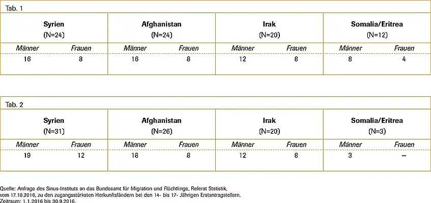 Unter Berücksichtigung der offiziellen BAMF-Statistik zu den minderjährigen Geflüchteten im Alter von 14 bis 17 Jahren war ursprünglich für die Studie ein entsprechender ethnischer und geschlechtsspezifischer Zuschnitt der Stichprobe entwickelt worden (siehe Tab. 1).