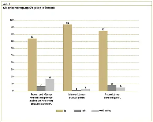Das Thema Gleichberechtigung wird vom Großteil der Jugendlichen gut verstanden und aufgenommen. Dennoch zeigen die Befragungen, dass diese Themen im Parcours stärker gesetzt werden müssen: Die Aussage »Frauen und Männer können sich gleichermaßen um Kinder und Haushalt kümmern« verneinen immerhin 7 Prozent der Schülerinnen und Schüler und 17 Prozent sind sich nicht sicher. Auch meinen 8 Prozent, dass Frauen nicht arbeiten gehen können, und hier sind 5 Prozent unsicher (s. Abb. 1).
